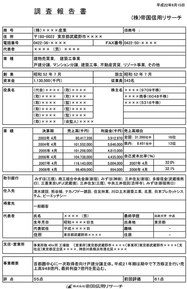帝国経済興信所が調査する項目は、商号、代表者、所在地、電話番号、FAX番号、資本金、株主、従業員数、設立・創業年月日、会社沿革、事業内容、仕入先、販売先、 取引銀行、取引状況、企業診断(評定)、業績、所見となります。これらの項目に関して、過去3年分の情報提供となりますので、直近の情報を迅速に知りたい方は側 面調査がおすすめです。